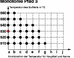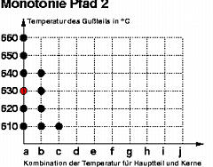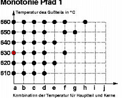 des Qualitätsvektors eine unterschiedliche Bedeutung zu, wenn mit seiner Hilfe die Gußteil insgesamt bewertet werden soll. Hier soll eine Änderung der Gesamtqualität des Gußteils schon dann als signifikant gelten, wenn für eine Konstellation von Eingangsparametern mindestens eine der Qualitätszahlen im Qualitätsvektor (gleich welche) außerhalb ihres Toleranzintervalls liegt. Aus Abbildung 9 ist zu erkenne, daß dann unabhänig voneinander die Anfangstemperatur im Gußteil Werte zwischen 600°C und 650°C und in der Kokille Werte gemäß den Kombinationen a und b (Tabelle 3) annehmen kann, ohne die Gußteilqualität signifikant zu ändern, weil in diesem Fall die Qualitätszahlen